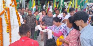 पंखाबारी,27 जुलाई(निसं): को आयोजनामा आइतवार लङ्भ्यूको केराबारीस्थित शहीद निमा थिङ अनि शहीद स्वरूपसिंह लकान्द्रीको शहीद वेदीमा शहीद दिवस पालन गरियो। कार्यक्रमको आरम्भमा समष्टि लगायत खरसाङ महकुमा अनि केन्द्रिय समितिका प्रतिनिधि अनि पार्टी सदस्यहरू लगायत उपस्थित सर्वसाधारण तथा शहीद परिवारका सदस्यहरूले शहीद वेदीमा धूप-दीप प्रज्वलन एवम् माल्यार्पण तथा पुष्प अर्पण गरे। त्यसपछि यहाँको गुम्बा परिसरमा एक कार्यक्रमको आयोजना गरिएको थियो। भागोप्रमो अधिनस्थ श्रमिक सङ्गठन, मकैबारी शाखा सभापति तथा केन्द्रिय समिति सदस्य मण्डल छेत्रीको सभापतित्वमा सम्पन्न कार्यक्रममा क्षेत्रिय कार्यकारि सभासद कल्पना प्रधान, समष्टि सभापति तथा सन्त मेरिज तीन ग्राम पञ्चायत प्रधान मणिराज डुम्जन, केन्द्रिय समिति सदस्य तथा सन्त मेरिज तीन ग्राम पञ्चायत उपप्रधान सन्तोष तामाङ, युवा शक्ति केन्द्रिय समिति उपाध्यक्ष अनुप गदाल, सदस्य सञ्जीव छेत्री, खरसाङ महकुमा प्रवक्ता अनुप रामुदामु लगायत समष्टिका अन्य प्रतिनिधिगण, विभिन्न शाखाका प्रतिनिधिहरू, ग्राम पञ्चायत प्रधानहरू, पञ्चायत सदस्यहरू, समिति सदस्यहरू लगायत पार्टीका विभिन्न भातृ संगठनका सदस्य एवम् प्रतिनिधिहरू उपस्थित थिए। समष्टि सचिव ललित प्रधानले सञ्चालन गरेको कार्यक्रमलाई अनूप गदाल, सभासद कल्पना प्रधान, समष्टि सभापति मणिराज डुम्जन, केन्द्रिय सदस्य सन्तोष तामाङ आदिले सम्बोधन गरेका थिए। तिनीहरूले भागोप्रमोलाई विपक्षी अनि विरोधीहरूले गोर्खाल्याण्ड बेच्ने पार्टी भन्ने गरेको प्रसङ्गबारे बोल्दै गोर्खाल्याण्ड नभइ कसरी बेचिन्छ भनी बताए। आज शहीदहरूकै त्याग र बलिदानले गर्दा पहाडमा अनित थापाको माध्यमबाट शान्ति अनि विकास भइरहेको जनाउँदै अझ शहीदहरूले न्याय पनि अनित थापाकै माध्यमबाट पाउने बताए। शहीदहरूलाई लिएर कसैले पनि राजनीति गर्नु नहुने बताउँदै आफ्नो जाति र माटोको निम्ति शहीदहरूले दिएको त्याग र बलिदान त्यसै खेर नजाने बताए। यसै अवसरमा समष्टिभरिका आठजना शहीद परिवारका सदस्यहरूलाई सम्मान पनि जनाइयो। कार्यक्रमपछि पत्रकारहरूसँग कुराकानी गर्दै सभासद कल्पना प्रधान अनि मणिराज डुम्जनले आज शहीदहरूलाई श्रद्धाञ्जली अर्पण गर्न समष्टिले यहाँ एक कार्यक्रमको आयोजना गरेको जनाए औ यस कार्यक्रममा समष्टिका सबै पार्टी कार्यकर्ता लगायत समर्थकहरू उपस्थित रहेर शहीदहरूलाई श्रद्धाञ्जली अर्पण गरेको जनाए।