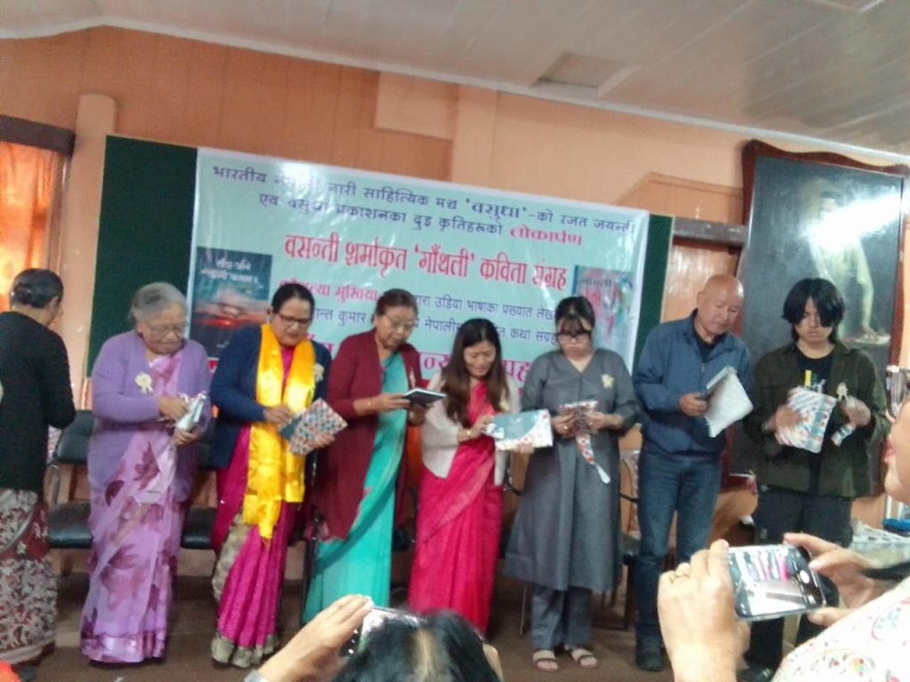 दार्जीलिङ, 3 अगस्त दार्जीलिङ(निस): वसुधा भारतीय नेपाली नारी साहित्यिक मञ्चको आयोजनामा मञ्चको रजत जयन्ती कार्यक्रमलाई विशेष केन्द्र गर्दै यसै पावन अवसरमा शुक्रबार गोर्खा दुःख निवारक सम्मेलन भवनको पुस्तकालय प्रेक्षा गृहमा कृति लोकार्पण सँगै अन्य विविध कार्यक्रमहरू सम्पन्न गरियो।