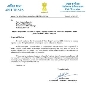 गोर्खाल्याण्ड क्षेत्रीयप्रशासनका प्रमुख कार्यपाल अनित थापाले जीटीए क्षेत्रका लागि अनिवार्य क्षेत्रीय सिनेमा नीतिमा नेपाली भाषाका चलचित्र समावेशको अनुरोध गर्दै पश्चिम बंगालका माननीय मुख्यमन्त्री सुश्री ममता ब्यानर्जीलाई एउटा पत्र लेखेका छन्। पत्रमा उल्लेख गरिएको छ, देशका विभिन्न क्षेत्रका भाषा, संस्कृति र सिनेमा संरक्षण तथा प्रवर्द्धनको निम्ति पश्चिम बंगाल सरकारले गरेका प्रयासहरु स्वागतयोग्य छन्। यसै प्रसंगमा, गोर्खाल्याण्ड क्षेत्रीय प्रशासन (जीटीए) अन्तर्गत नेपालीभाषी समुदायको सांस्कृतिक पहिचान र समृद्धिको लागि सिनेमाघरहरुमा अनिवार्यरुपमा नेपाली भाषाका चलचित्र प्रदर्शन गराउने व्यवस्था आवश्यक छ भन्ने मेरो गम्भीर माग रहेको छ।