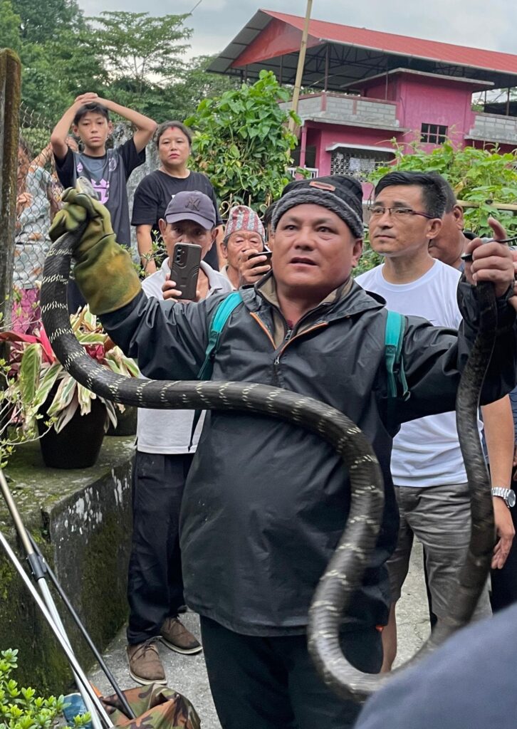 खरसाङ,21 जून (मोहन प्रसाद): खरसाङ स्थित अम्बोटे चिया बगानबाट वन विभागको खरसाङ रेञ्जका वनकर्मीहरूद्वारा शुक्रवार बेलुकी लगभग 10 फीट लामो किङ कोब्रा उद्धार गरिएको छ। खरसाङ वन विभागका खरसाङ रेञ्ज अधिकारी सम्ब्रत साधुले जनाए अनुसार शुक्रवार अमबोटे चिया बगानको एउटा घरमा किङ कोब्रा देखिएको खबर पाए पछि लगत्तै वन विभाग खरसाङ रेञ्जका वनकर्मीहरू रोशन थापा अनि सुयोक प्रधान घटना स्थलमा पुगे। घटना स्थलमा पुगेर यी वनकर्मीहरूले लगभग 10 फीट लामो किङ कोब्रालाई सफलता पूर्वक उद्धार गरे । उक्त विशाल किङ कोब्रा गाउँमा देखा परेपछि स्थानीय मानिसहरू भयभीत बनेका थिए। वन कर्मीहरूद्वारा उक्त कोबरालाई उद्धार गरेपछि स्थानीयहरूले राहत सास फेरेका छन्। उद्धार गरिएको कोब्रालाई पछि एउटा जंगलमा सुरक्षित छोडिएको छ। साधुले थप जनाए अनुसार, खरसाङ रेञ्ज अन्तर्गत एक महिना भित्रमा यो तेस्रो पल्ट विशाल किङ कोबरा उद्धार गरिएको हो। एक वर्ष भित्रमा 10 वटा यस्ता विभिन्न किङ कोब्रा खरसाङ रेञ्जको विभिन्न स्थानबाट उद्धार गरिएको छ। तिनले यो पनि जनाए कि जुन प्रकारले जलवायु परिवर्तन भइरहेको छ, मधेश क्षेत्रमा वर्तमानमा अधिक गरम भइरहेको छ। यसैले किङ कोब्राहरू मधेशबाट पहाड़तिर आइरहेका छन्। तिनले कुनै पनि स्थानमा किङ कोब्रा देखिएको खण्डमा भयभीत नहुने, सचेत रहने अनि यसको जानकारी तुरुन्तै वन विभागलाई दिने पनि अपिल गरेका छन्।