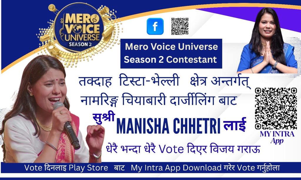 मेरो भोइस युनिभर्स प्रतियोगिताको टप नाइनमा पुगेकी मनिषा छेत्रीलाई भोट दिने अनुरोध गरिएको छ। मनिषा छेत्री फ्यान क्लबका सदस्यहरूले दर्शकहरूलाई यी गोर्खे चेलीलाई भोट दिने अनुरोध गरेका छन्। यसरी नै मनिषा छेत्री आफैले पनि आफ्ना शुभचिन्तकहरूलाई भोट दिएक जिताउने अनुरोध गरेकी छिन्।